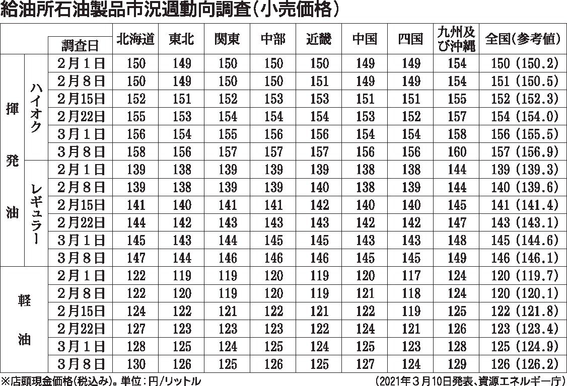 資源エネルギー庁が10日発表したレギュラーガソリン1㍑当たりの店頭価格(8日時点)は、全国平均で前週比1円50銭高の146円10銭となり、1年ぶりの高値となった。値上がりは15週連続。新型コロナウイルスの影響で国内のガソリン需要は低調だが...