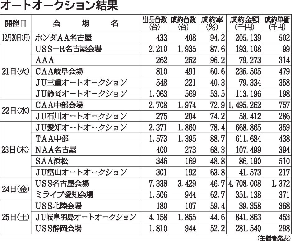 〈オートオークション結果〉中部地区 2021/12/20~25