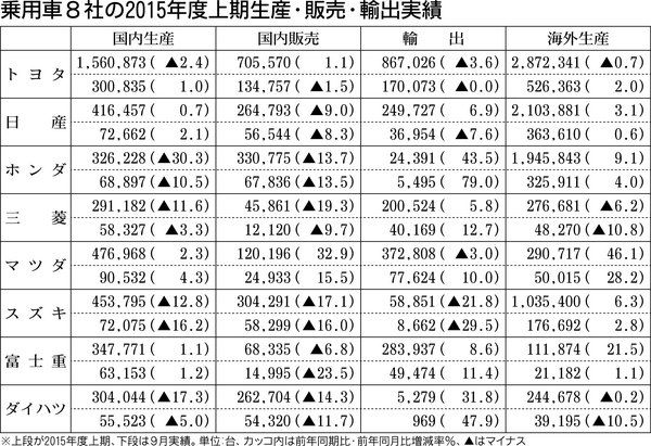 乗用車メーカー8社は26日、2015年度上期(4~9月)の生産・輸出実績を発表した。国内生産は5社が前期実績を下回ったことなどから、合計では前年同期比7・3%減の417万7318台となった。軽自動車税の増税などによる国内販売の低迷などが影...