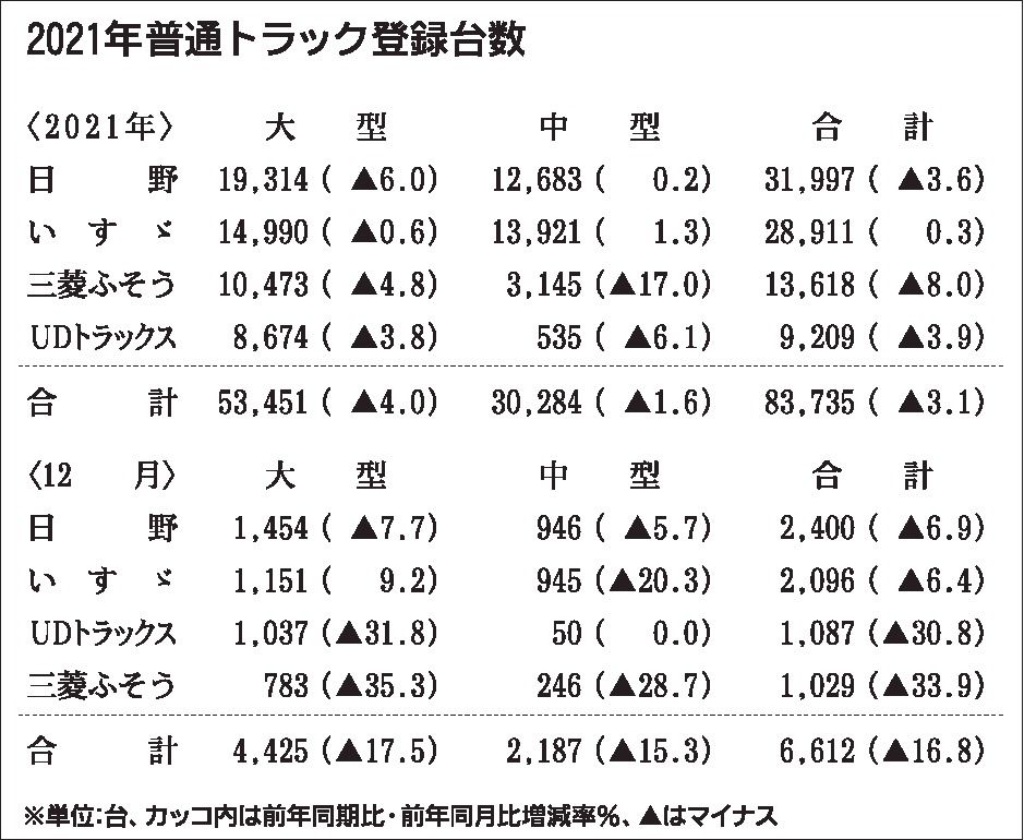2021年の国内普通トラック販売、3.1%減 2年連続マイナス 生産停滞が響く