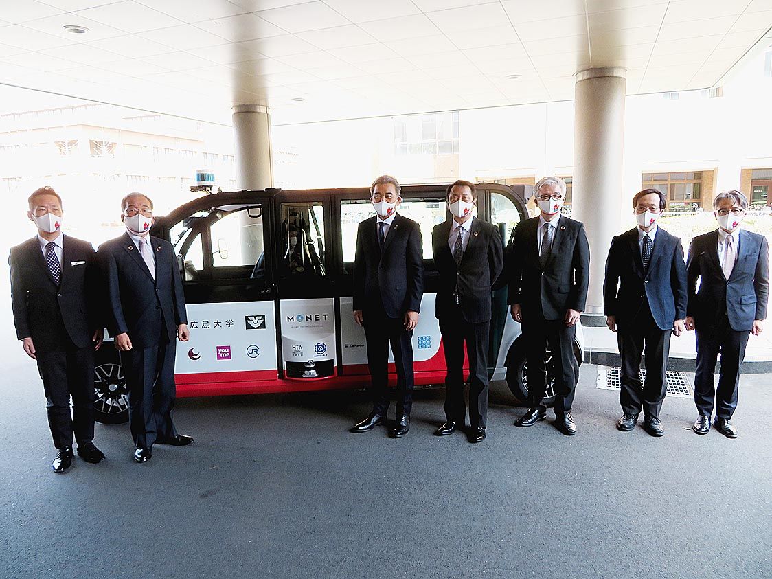 【広島】モネ・テクノロジーズ(宮川潤一社長兼CEO、東京都千代田区)と広島大学(越智光夫学長)、東広島市(高垣広徳市長)は、同市の広島大学構内で自動運転シャトルのお披露目式を実施した=写真。15日にスタートした大学構内での自動運転の実証実...