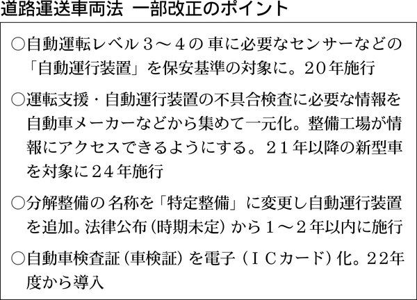 道路運送車両法の一部を改正する法律案が8日、閣議決定された。車の電子化や自動運転の実用化を念頭に、設計・開発から使用、整備にわたって次世代車の安全性を確保する制度を整える。今国会に提出、審議し、早期施行を目指す。 道路運送車両法の一部改正...