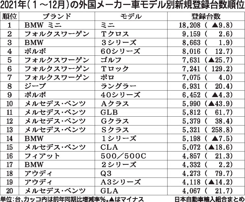 3位には同1.9%増の8663台でBMW「3シリーズ」が続き、13年以来8年ぶりにトップ3に返り咲いた。前年2位のMB「Aクラス」は同43.9%減の5990台と大きく落ち込み10位に後退し、前年9位の「Cクラス」もトップ20圏外となった。20年7月に国内投入されたVW「Tロック」が同129.2%増の7241台で6位となり、ジープ「ラングラー」も同20.4%増の6931台で初めてトップ20入りするなどSUVが躍進した。上位20モデルのうち、SUV専用車種全7モデルを含む13モデルが前年実績を上回った。