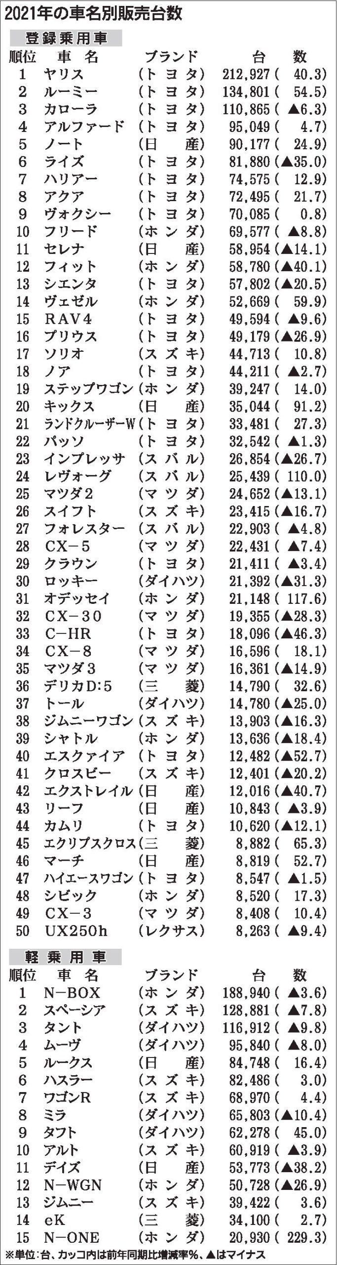 2021年の新車販売ランキング、「ヤリス」初のトップ 登録車首位はプリウス以来5年ぶり 「N-BOX」は半導体不足で2位