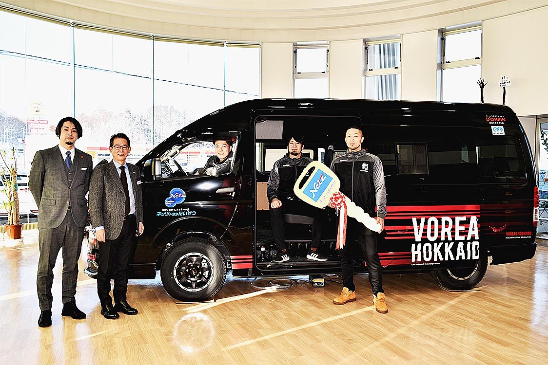 ○…目指せV1昇格―。ネッツトヨタたいせつ(渡邊智社長)は、旭川を本拠地とするVリーグプロバレーボールチームのヴォレアス北海道(池田憲士郎社長)にハイエース1台の提供を決め、6日に末広店で贈呈式を行った。 ○…贈呈式にはヴォレアスの池田社...