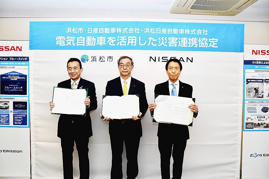 浜松市(鈴木康友市長)と日産自動車、浜松日産(樋口明宏社長)は、災害時に電気自動車(EV)を活用して地域住民の支援や行政機能の維持などに協力する「電気自動車を活用した災害連携協定」を締結した。日産が県内の自治体と同協定を結ぶのは初めて。 ...