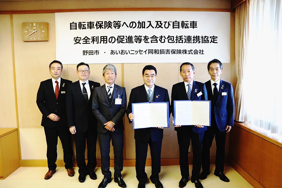 【千葉】あいおいニッセイ同和損害保険は、地域創生を目的とした包括連携協定を野田市、いすみ市と結んだ。野田市では自転車保険の加入促進、いすみ市とは防災セミナーの開催などで連携する。 同社理事の田中忠之千葉地域担当らが野田市の鈴木有市長、いす...