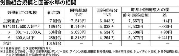 ◆不透明な経済環境など影響 全トヨタ労働組合連合会(全トヨタ労連)がまとめた製造加盟組合の春闘回答状況(15日時点)によると、賃金カーブ維持分(定昇)や是正分を合わせた平均賃金回答額(120組合中の101組合)は5788円で、ほぼ前年(5...