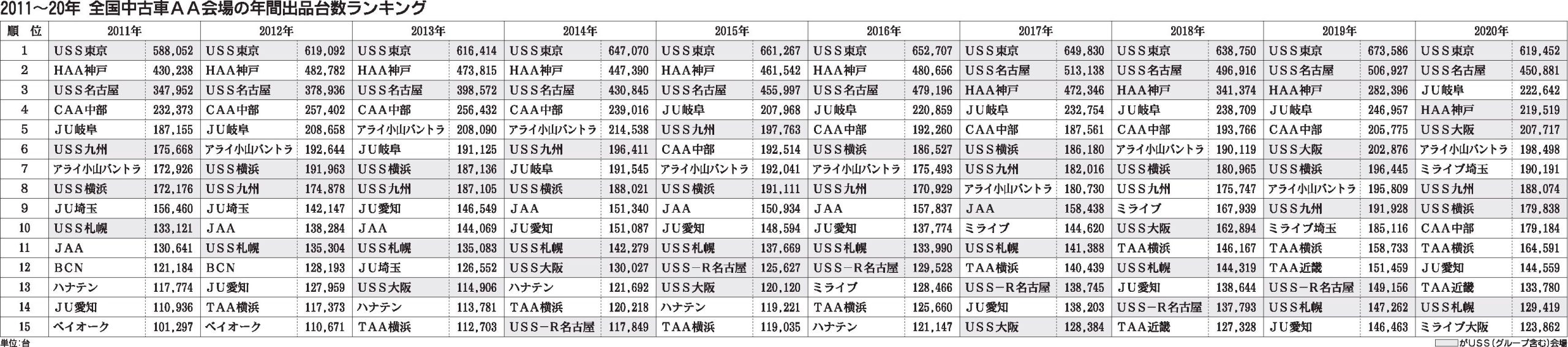 中古車オークション(AA)市場でユー・エス・エス(USS)の強さが鮮明に―。日刊自動車新聞社では2011~20年の各会場別の出品台数をまとめた。この10年間で出品台数の上位会場の顔ぶれが入れ変わる中で、20年はベスト5のうち4会場をUSS...