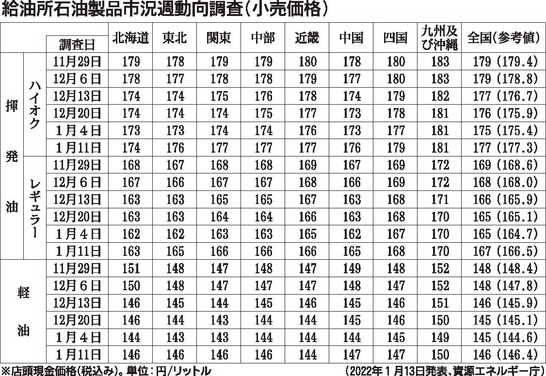 〈給油所石油製品市況週動向調査(小売価格)〉2021/11/29~2022/1/11