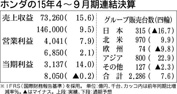 ホンダが4日発表した2015年4~9月期の連結業績(IFRS、国際財務報告基準)は、増収増益となった。品質関連費用を含む販売管理費の増加などがあったものの、北米や中国市場の好調などを反映した結果となった。16年3月期通期見通しでは前回(7...