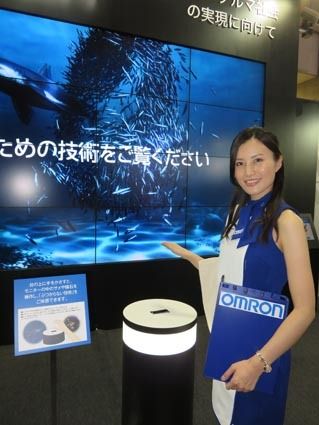 イワシの群れは、ぶつからないクルマ社会?―オムロンは大画面を使って1万5千匹のイワシが海の中を泳ぐ体験型デモを実施している。 センサーの付いた台に手をかざすと現れる大きなサメ。イワシは特殊な器官で察知して逃げるが、互いにぶつかることはない...