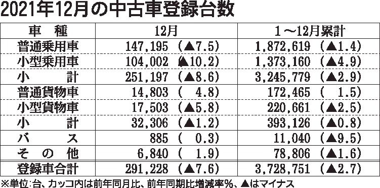 2021年の中古車登録台数は、前年比2・7%減の372万8751台で、1978年の統計開始以来、最低だった。5月まで前年同月実績を上回る水準で推移したものの、年後半は半導体不足などに伴う新車販売の落ち込みで新たな中古車の発生量が激減。小売...