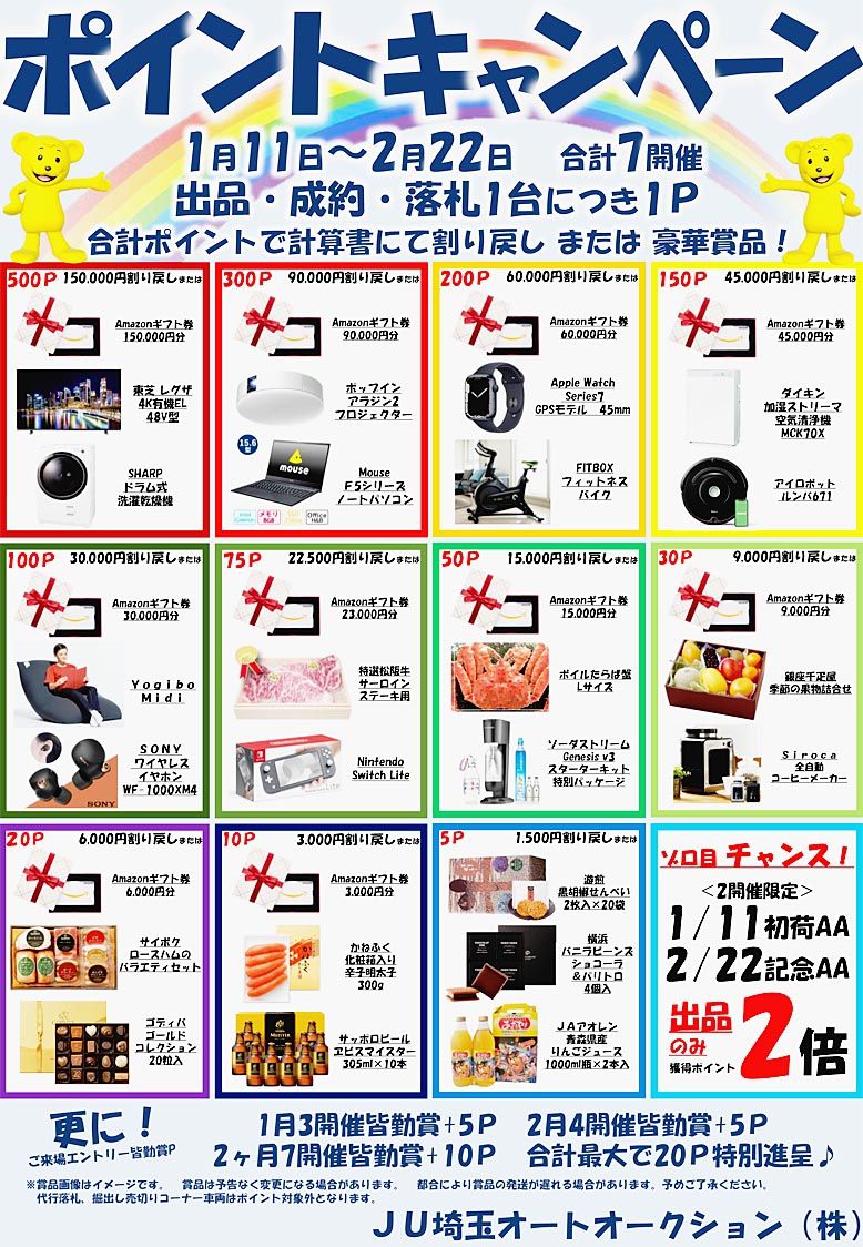 【さいたま】JU埼玉オートオークション(JU埼玉AA、薄辰美社長)は、AA活性化を目的に「ポイントキャンペーン」を開始した=写真。出品、成約、落札の各1台を1ポイントとし、キャンペーン終了後に合計ポイントにて応じて豪華賞品が当たるなどの特...
