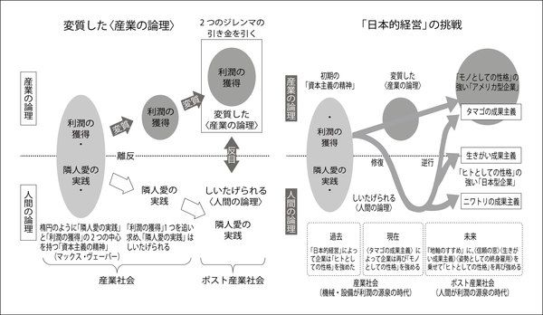 これからは、人が主役となる時代です。図の左側は〈産業の論理〉が変質していく様子を描き、右側はそれにどう「日本的経営」は対応すべきかを描いたものです(右側の説明は割愛。出所、拙著『「働くこと」を企業と大人にたずねたい』東洋経済新報社、201...