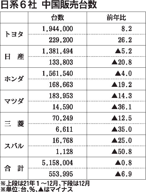 国内自動車メーカー6社の2021年における中国新車販売台数は、前年比0・8%減の515万8004台となった。トヨタ自動車が過去最高を更新したものの、残る5社が半導体不足などによる生産影響でマイナスとなり、明暗が分かれた。中国汽車工業協会に...