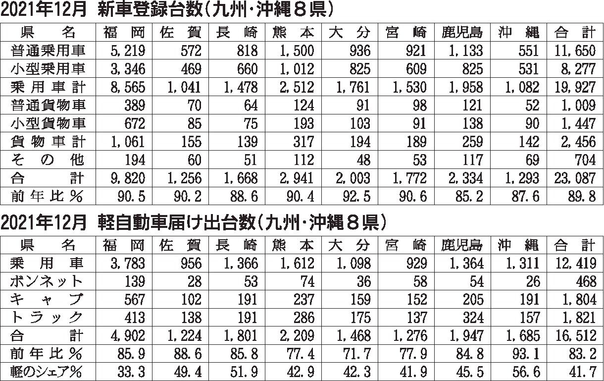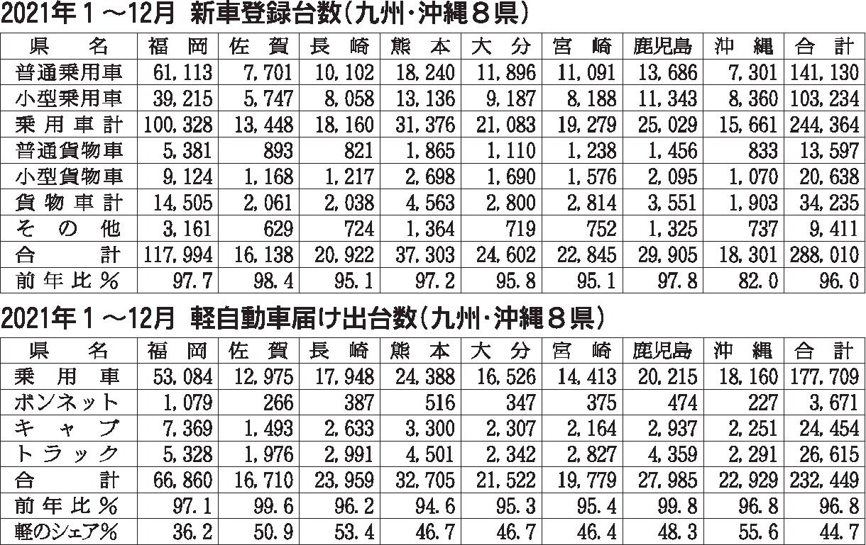 九州・沖縄地区の2021年(1~12月)の新車販売台数は、前年比3・7%減の52万459台となり、3年連続で前年実績を下回った。新型車を中心に受注は順調に積み上がっているものの、半導体不足による生産量の減少などの影響を受け、登録車と軽自動...
