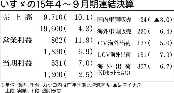いすゞ自動車が6日発表した2015年4~9月期の連結業績は増収増益となった。国内市場が好調だったことに加え、大型トラックの海外出荷台数が過去最高となったほか、原価低減活動や為替差益などが増益に寄与した。片山正則社長は「市場はさまざまな環境...