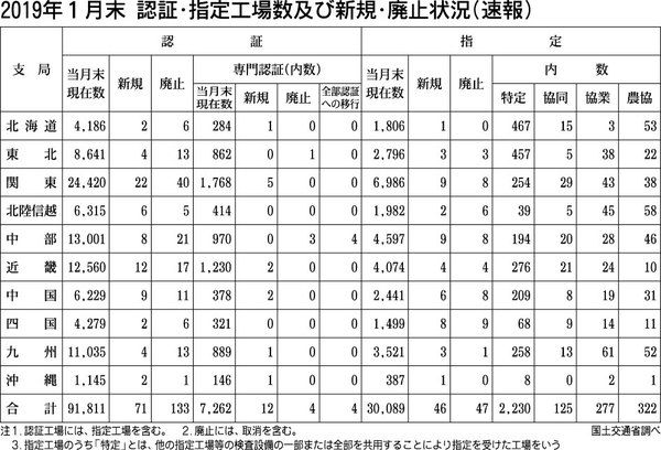 国土交通省は2019年1月末時点の認証・指定工場数および新規・廃止状況をまとめた。認証工場数は9万1811工場で前月比63件減となった。指定工場は前月比増減なしの3万89工場だった。専門認証工場数は4件増の7262工場だった。 前年同月比...
