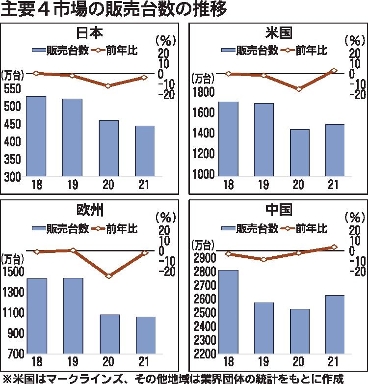 世界の主要市場の2021年の新車販売台数が出そろった。日本は前年比3・3%減、欧州が同1・9%減となり、いずれも新型コロナウイルス感染拡大の影響があった20年実績を下回った。市場規模が世界1位、2位の中国と米国はともに前年を上回ったものの...