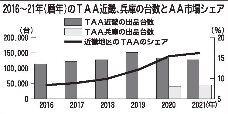 トヨタユーゼック(北口武志社長、千葉市美浜区)のトヨタオートオークション(TAA)が、近畿地区での存在感を高めている。TAA近畿、TAA兵庫の合計の2021年1~12月の出品台数は、前年比0・6%減の17万3741台で、近畿地区の中古車オ...