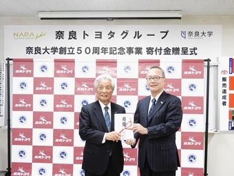 【奈良】奈良トヨタ(菊池攻社長)グループは、地域貢献活動の一環として「奈良大学創立50周年記念事業」に寄付金100万円を贈呈した。同校への寄付は初めて。寄付金は50周年記念館の建設などに役立てられる。 20日に本社(田原本町)で「寄付金贈...