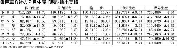 国内自動車メーカーの世界生産が、大市場である中国と北米の需要減を受け軒並み減少した。乗用車メーカー8社が28日に発表した2月の世界生産の合計台数は、前年同月比3・0%減の222万3660万台となり、2カ月ぶりのマイナスとなった。メーカー別...