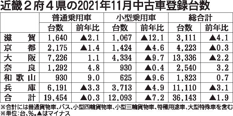 2021年11月の近畿地区中古車登録実績(軽自動車を除く)がまとまった。新規・移転・変更手続きを合算した登録台数は前年同月比1・9%減の3万6143台だった。前年割れは6カ月連続となったが、下げ幅は10月から8・4㌽改善した。車種別では、...