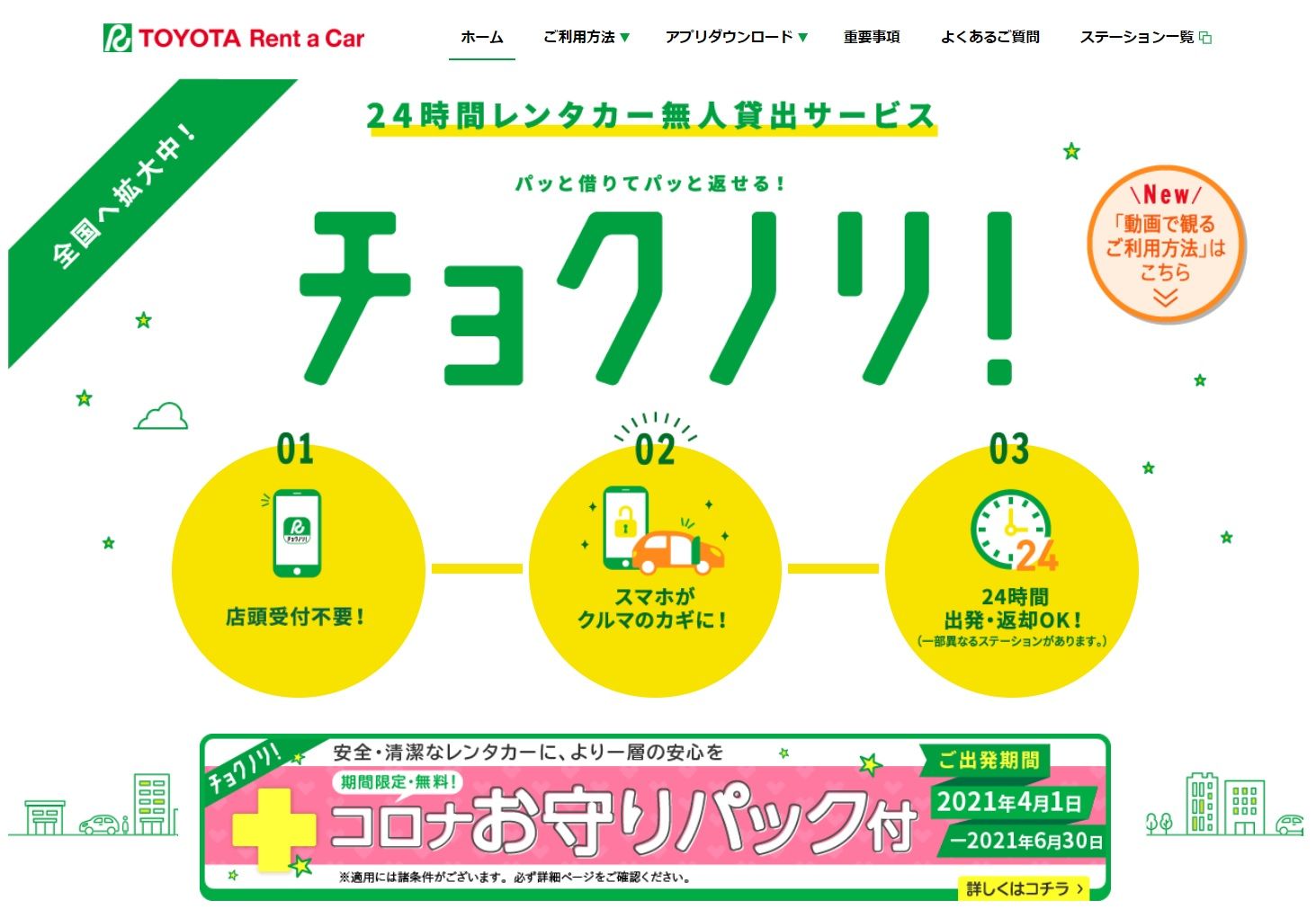 チョクノリ!は、トヨタが2019年秋に始めた無人貸し渡し型のレンタカーサービス。スマートフォンの専用アプリ経由で、解錠・施錠デバイスを搭載した約460台を全国の255拠点で貸し出している。トヨタはこのほか、新型コロナ対策として法人向けに割安なリースサービスを用意したり、ソーシャルワーカー向けに「通勤アシストレンタカー」として割安なサービスを提供したりしている。