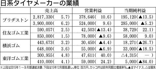 タイヤメーカー4社の2015年1~9月期の業績が出揃った。世界的なタイヤ需要の拡大を背景に4社ともに売上高で過去最高を記録。一方で国内での新車販売の落ち込みや補修用タイヤ市場の競争激化などを受けて、営業利益は前年を下回るケースも見られた。...