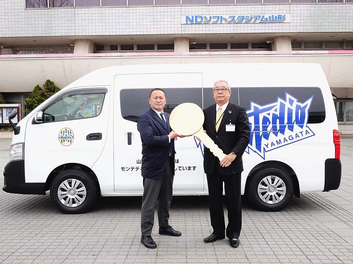 【山形】山形県内の日産販売会社3社で構成する日産山形会(小関眞一会長)は25日、サッカーJ2のモンテディオ山形(相田健太郎社長)に「NV350キャラバン」を1台寄贈した。同日に天童市のNDソフトスタジアム山形で贈呈式を開催し、小関会長が相...