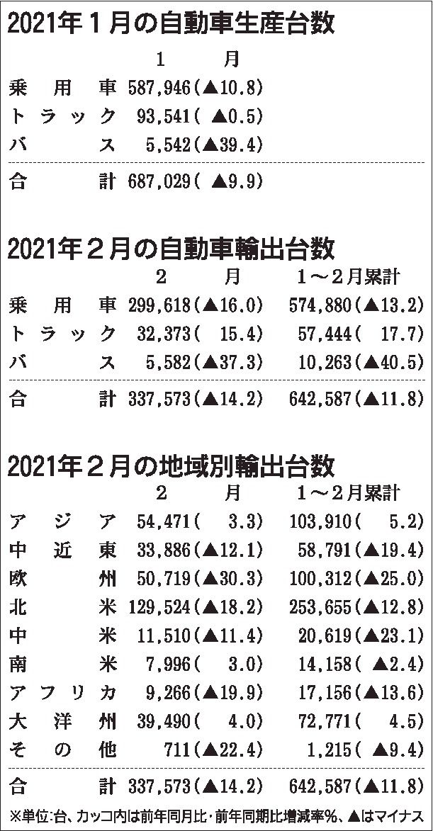 日本自動車工業会(自工会、豊田章男会長)が31日発表した2月の自動車輸出台数は、前年同月比14・2%減の33万7573台となり、4カ月連続で前年実績を下回った。最大仕向け地の米国は同18・1%減の11万3565台。中国向けも微減となったが...