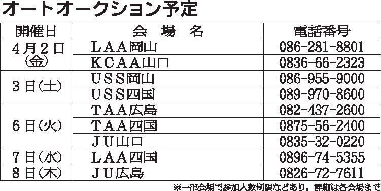 〈オートオークション予定〉中四国地区 2021/4/2~8