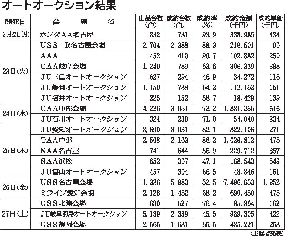 〈オートオークション結果〉中部地区 2021/3/22~27