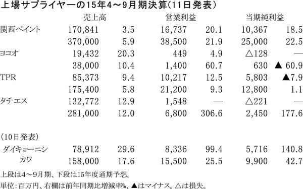 【上場サプライヤーの15年4~9月期決算(11日発表)】