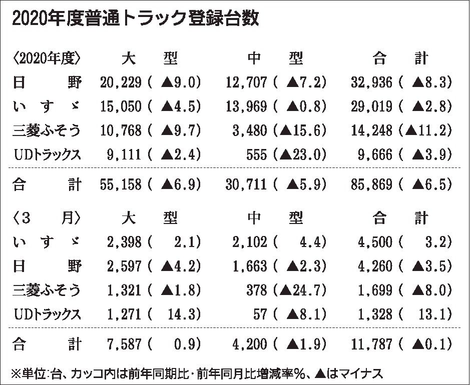 2020年度の普通トラック新車販売、3年ぶり前年度下回る