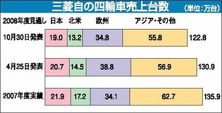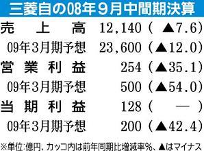 三菱自動車は30日、2009年3月期の通期業績予想(連結)の下方修正を発表した。4月25日の前回公表値に対し、売上高は2兆6500億円から2兆3600億円(10・9%減)、営業利益は600億円から500億円(16・7%減)に引き下げた。欧...