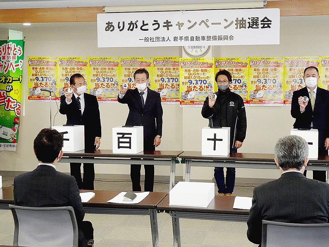 【盛岡】岩手県自動車整備振興会(千葉泰会長)は、矢巾町の岩手県自動車会館で「第35回ありがとうキャンペーン抽選会」を開催した=写真。昨年に引き続き、例年の海外旅行賞品などを取り止め、金額別のクオカードに統一した。 賞品は特等のクオカード5...