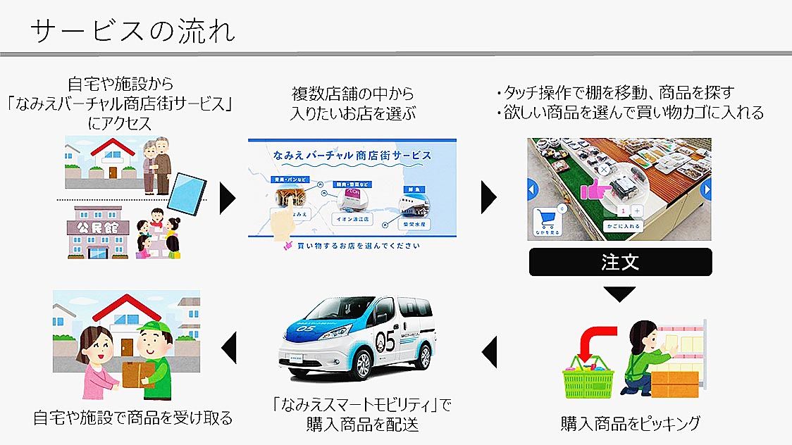 日産自動車は24日、凸版印刷などとVR(仮想現実)技術を活用して地域住民の消費活動を支援する実証実験を福島県浪江町で開始したと発表した。町内の食料品店の売り場をリアルタイムに見ることができるタブレット端末でユーザーが注文した商品を、日産が提供するモビリティサービスの車両に貨客混載し、自宅に配送する。暮らしやすさの向上や地域商業の活性化を目指し、遠隔購買サービスの需要や実用化に向けた課題を検証する。