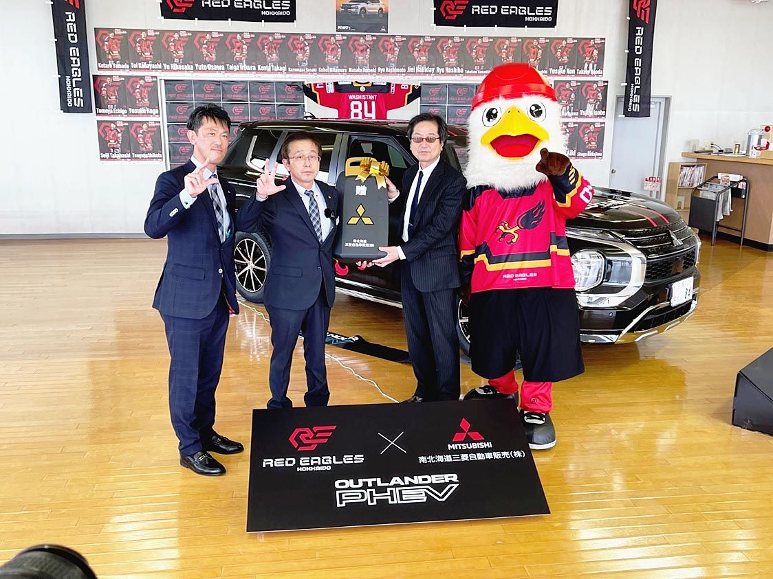 南北海道三菱(栗橋和幸社長)は、地元アイスホッケークラブチーム「レッドイーグルス北海道」に、三菱「アウトランダーPHEⅤ」1台を無償貸与した。同社の本社ショールームで贈呈式が開催され、赤い鷲をイメージしたデザインにラッピングされた車が披露...