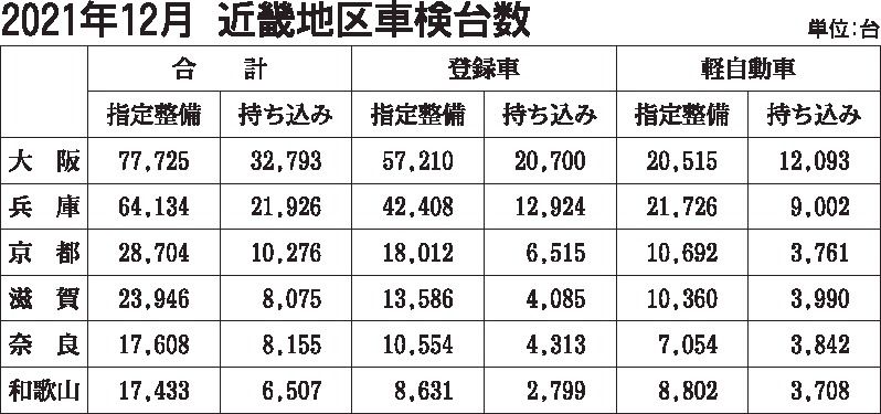 近畿地区の2021年12月の継続検査(車検)台数(軽自動車を含む)は、前年同月比3・1%減の31万7282台となり、2カ月ぶりに前年を下回った。登録車が同7・4%減の20万1737台だったが、軽は同2・9%増の11万5545台で、2カ月連...
