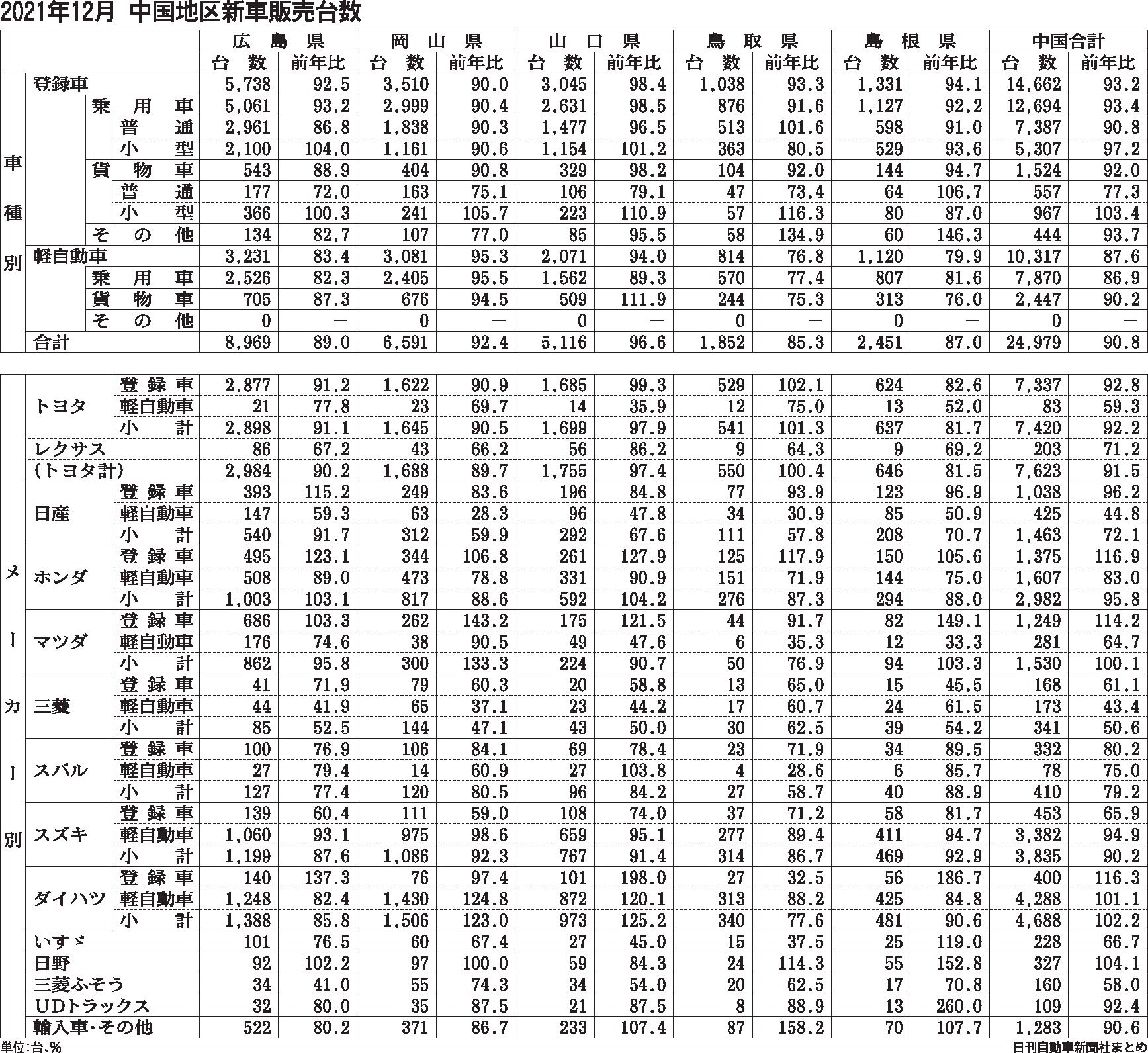 〈2021年12月 中国地区新車販売台数〉