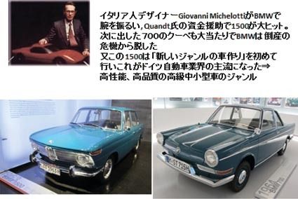 ◆新車の制作(続) BMWが高級車として認知されてきたのは1962年フランクフルト・モーター・ショーで発表した「ニュー・クラス(Neue Klasse)」と言う中型車ながら高品質、高級感、スポーティーさを売り物にしたモデル、”1500“の...