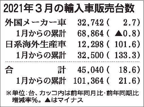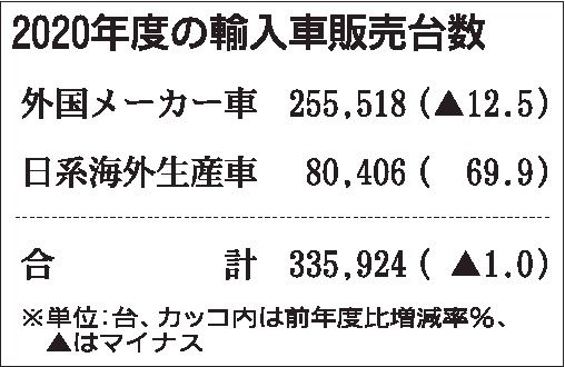 日本自動車輸入組合(JAIA、ティル・シェア理事長)が6日発表した2020年度の外国メーカー車新規登録台数は、前年度比12・5%減の25万5518台で、リーマンショックがあった08年度以来12年ぶりの2桁減となった。前年度実績を下回るのは...