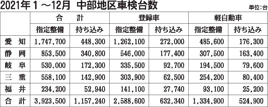 中部地区の2021年1~12月継続検査(車検)台数(登録車+軽自動車)は、前年比7・8%増の508万740台となった。車検台数の内訳は登録車(二輪車を除く)が同3・0%増の322万940台、軽が同15・5%増の185万9800台。半導体不...