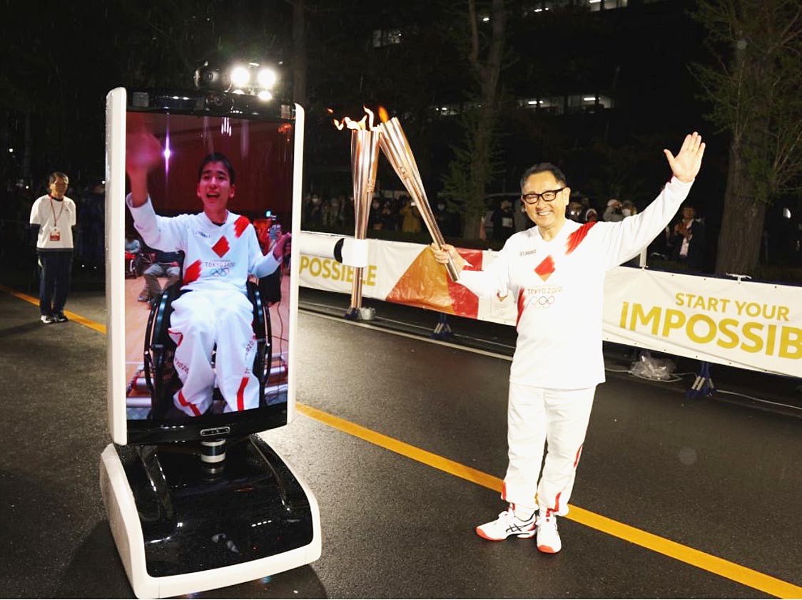 3年前からトヨタがグローバルパートナーを務める「スペシャルオリンピックス」(知的障がい者によるスポーツ組織)のチームから聖火を引き継いだ豊田社長は雨の中を力走し、米子会社が開発した電動ロボットに聖火をつないだ。ロボットは足が不自由な高校生、鈴木俊介さんと通信経由でつながっており、鈴木さんは愛知県内の医療施設から中継画像を通じて聖火リレーを仮想体験した。鈴木さんの祖父はトヨタの元陸上部員で、前回の東京五輪で聖火ランナーを務めた。鈴木さんがラリーや“モリゾウ”のファンだと知った豊田社長は1年前に鈴木さんと聖火リレーの約束を交わしたという。
