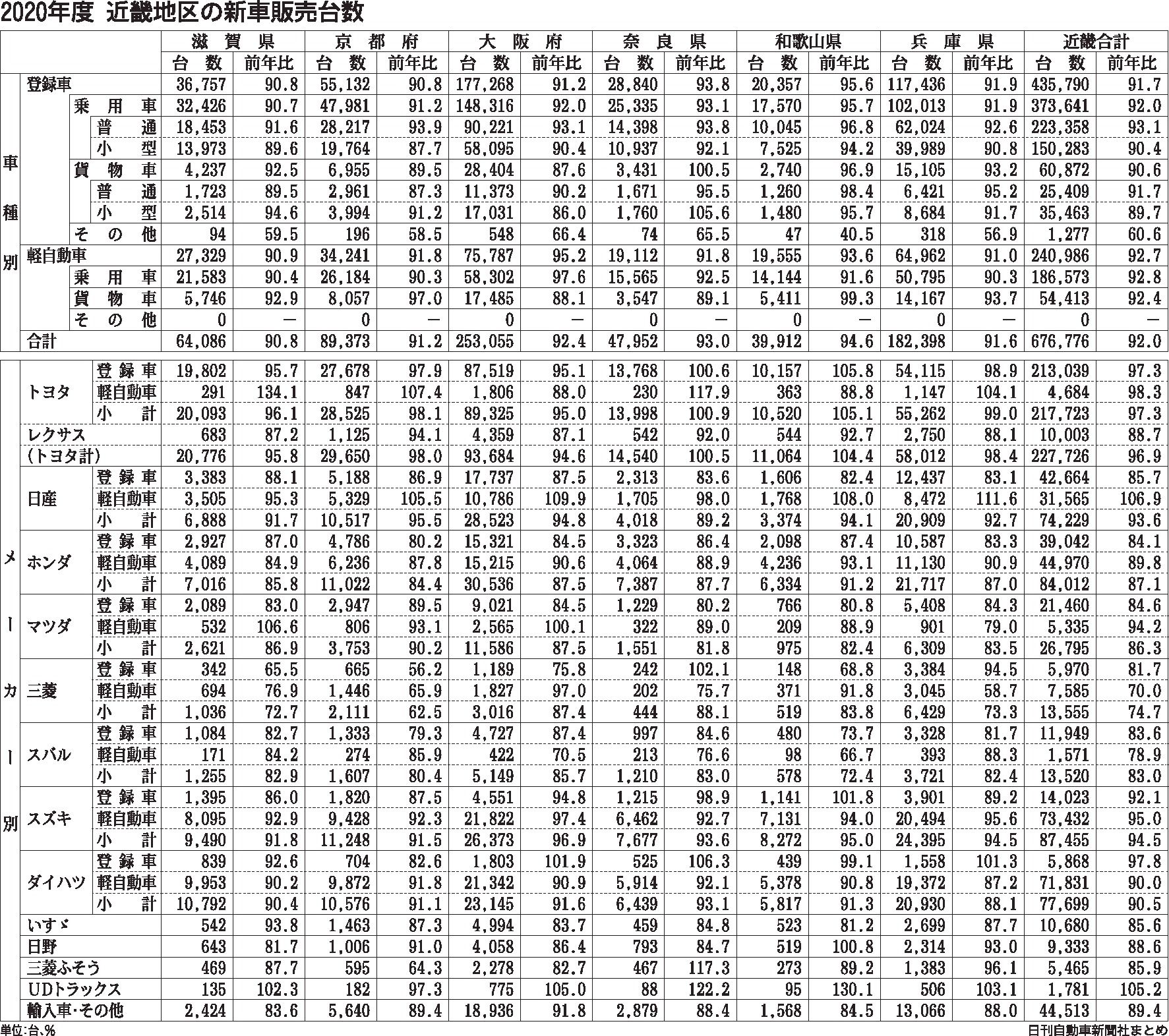 近畿2府4県 2020年度新車販売台数、2年連続で前年下回る 9年ぶり70万台割れ 3月単月は前年超