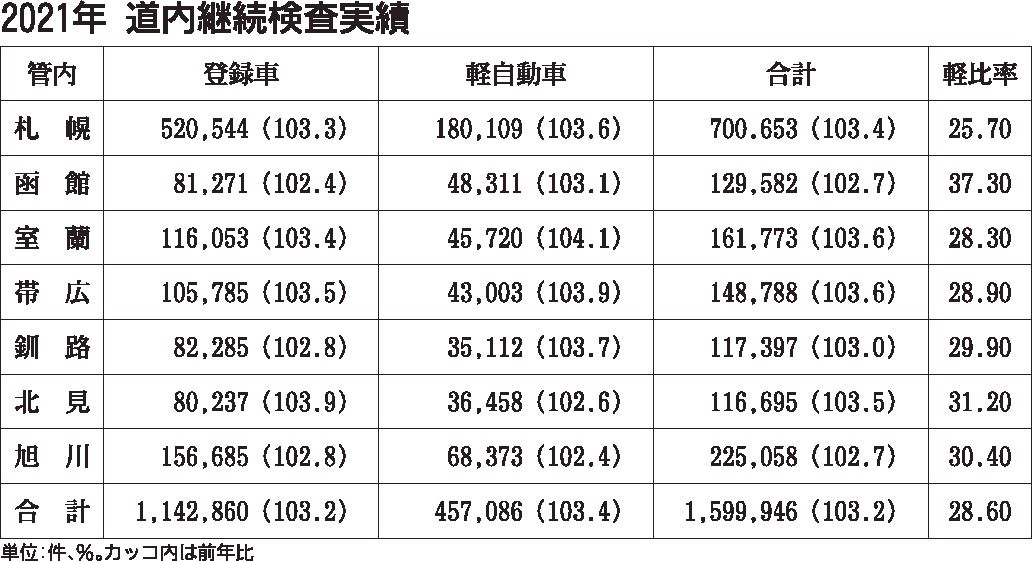 2021年の道内総継続検査件数(登録車と軽自動車の合計・速報値)は、前年比3・2%増の159万9946件となった。軽の比率は28・6%で、運輸支局管内別で函館は37・3%と最も高い。 北海道運輸局によると、登録車の継続検査は前年比3・2%...