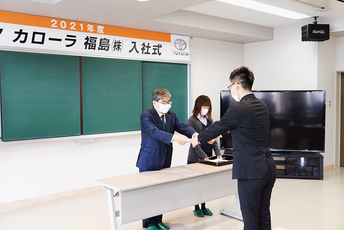 【福島】トヨタカローラ福島(佐藤良也社長)は3日、郡山市で「2021年度入社式」を開催した。総合職とサービス職の15人が入社し、役員が見守る中で新社会人としての自覚を新たにした。 佐藤社長は、新入社員一人ひとりに辞令を交付した後、「自分に...