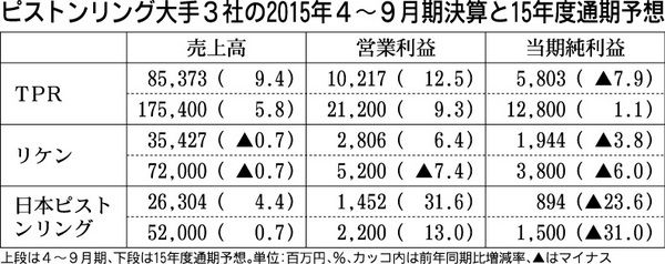 ピストンリング大手3社の2015年度上期(15年4~9月期)は、国内での自動車減産や東南アジアの景気低迷を好調な北米市場と為替の円安が下支えし、3社が営業増益となった。ピストンリングのグローバル需要は自動車、産業・建設機械ともに伸び悩んだ...